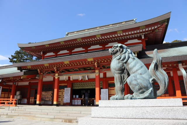 本殿の前には日本最大級の青銅製の狛犬があり、高さ3.5メートル以上にも及ぶその姿は、大人が横に並んでみても、狛犬の足元に頭が来るほどに大きく、その迫力は必見です。